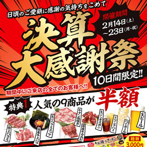 Home お知らせ, イベント 2/14から決算大感謝祭開催 2/14から決算大感謝祭開催 2026.02.12 お知らせ、イベント Post Share Hatena Pocket RSS feedly Pin it 日頃のご愛顧に感謝を込めて、10日間限定の特別企画☆ 開催期間:2月14日(土)~ 2月23日(月・祝) 単品で攻めるもよし☆ いつもの食べ放題にプラスoneもよし☆☆ とにかくお得な10日間☆☆☆